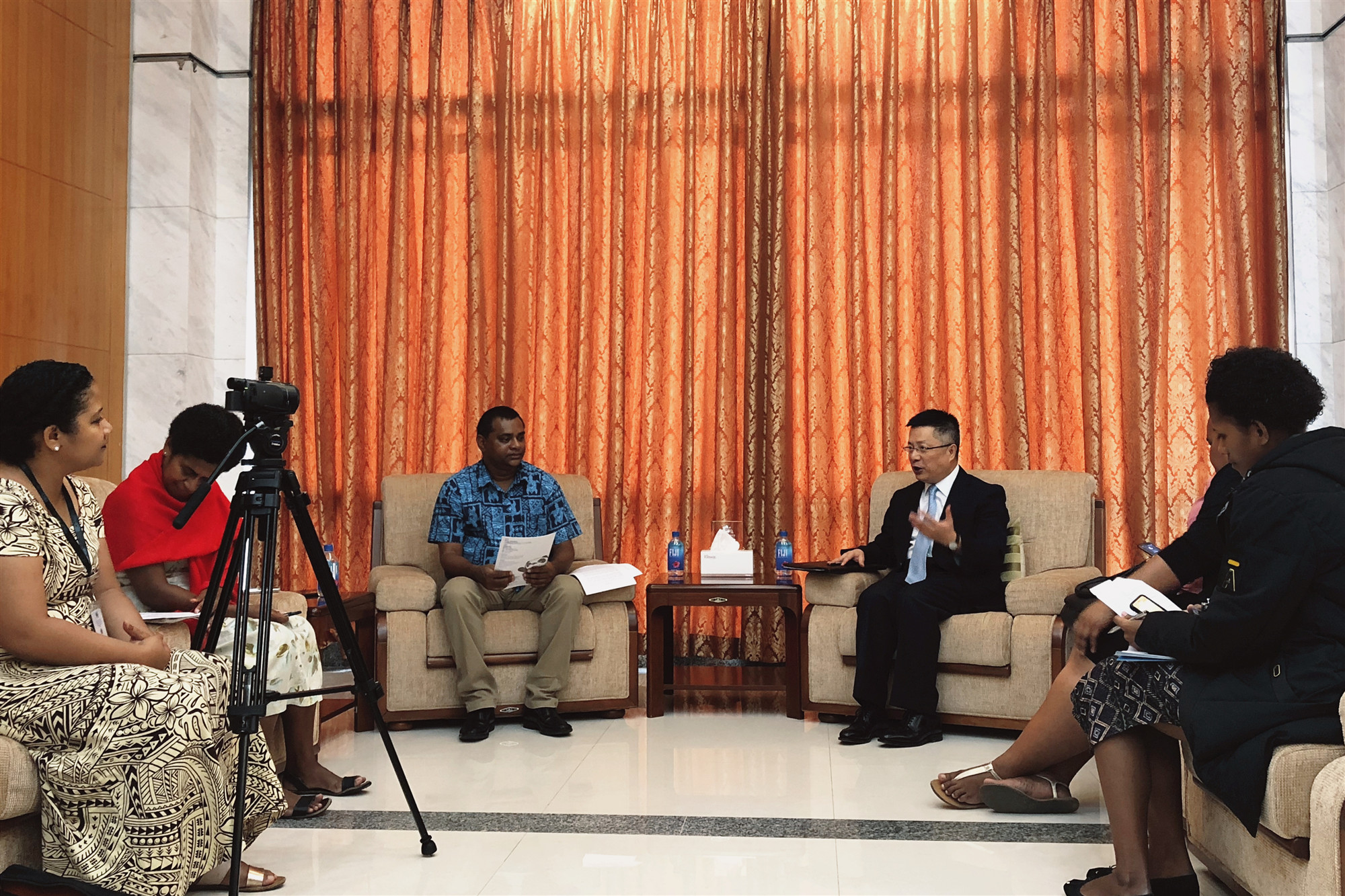4月9日,中国驻斐济使馆举行媒体吹风会,邀请斐济主流媒体《斐济太阳报》、《斐济时报》、斐济广播公司、玛宜电视台、斐济村网以及《斐济日报》(中文)、新华社驻斐记者参加。钱波大使就第二届“一带一路”国际合作高峰论坛等我重大外交活动向中外媒体吹风。